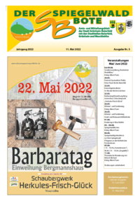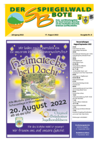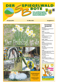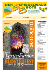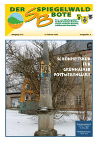 Der Spiegelwaldbote für öffentliche Bekanntmachungen und Mitteilungen der Stadt Grünhain-Beierfeld erscheint monatlich. Unternehmen, Institutionen und Vereine haben die Möglichkeit, Informationen zu veröffentlichen. Anzeigen, Veranstaltungshinweise und allgemeine Informationen runden das Angebot ab.