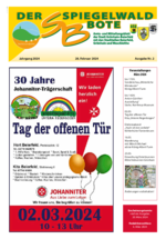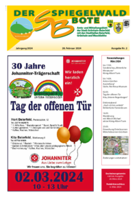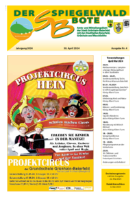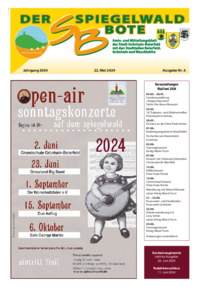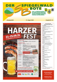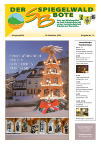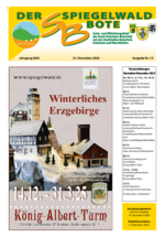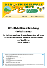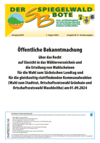 Der Spiegelwaldbote für öffentliche Bekanntmachungen und Mitteilungen der Stadt Grünhain-Beierfeld erscheint monatlich. Unternehmen, Institutionen und Vereine haben die Möglichkeit, Informationen zu veröffentlichen. Anzeigen, Veranstaltungshinweise und allgemeine Informationen runden das Angebot ab.