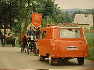 Vornweg die alte Spritze und der B1000 und dahinter das neue Einsatzfahrzeug.