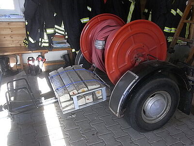 Bei Brandeinsätzen wird der Schlauchtransportanhänger mitgeführt.